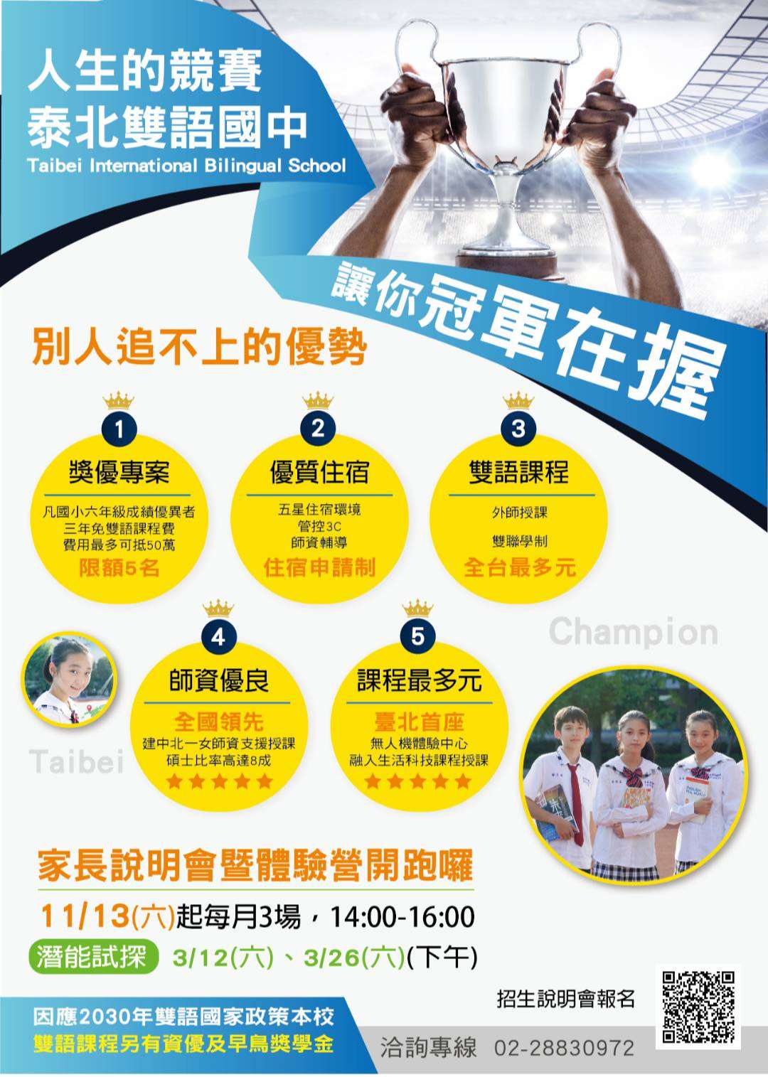 三、為了讓國小五六年級的學生與家長更能了解本校國中部的 辦學精神,於110年11月13日起至111年3月26日(星期六) 止,辦理新生體驗營暨家長說明會。說明會報名方式可至本校招生專網預約報名 (https://reurl.cc/Rb9gpe)或撥打招生專線電話報名( 28830972、28825560分機 215、121)。為獎勵優秀學子,市長獎、議長獎入學者,高達50 萬元獎學金(限額,分期給付,第2學期起有續領條件)。