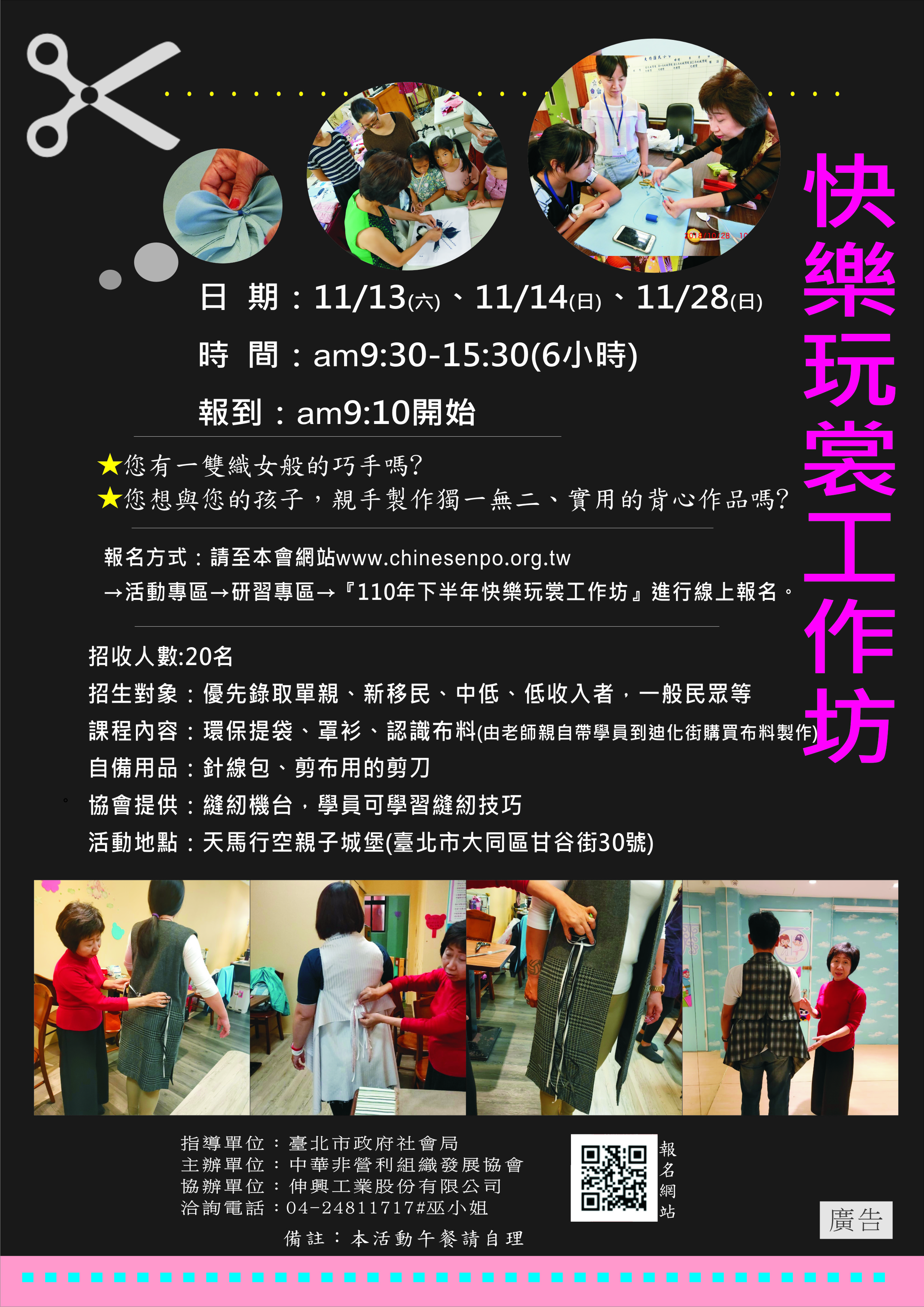五、報名方式:請至本會網站www.chinesenpo.org.tw→活動專區→研習專區→『110年下半年度快樂玩裳工作坊』進行報名,謝謝!