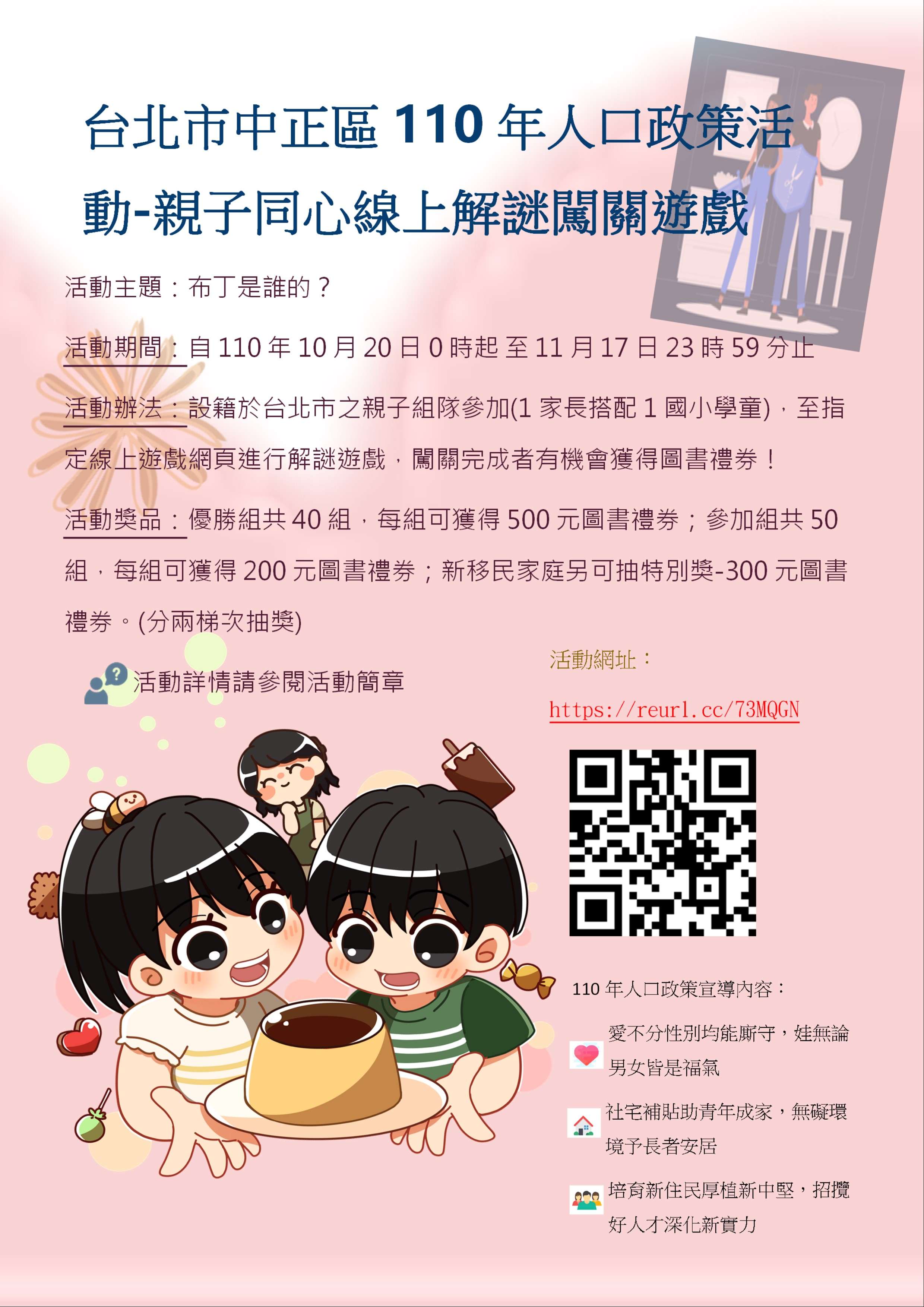 二、宣導文稿如下,請參酌使用:「臺北市中正區公所將於 110年10月20日至11月17日止,辦理110年人口政策宣導 活動—『親子同心線上解謎遊戲』,完成線上遊戲後即可抽圖書禮券!詳情請見中正區公所網站(https://zzdo.gov.taipei/)查詢或電洽02-23416721分機317孫小姐,歡迎設籍本市的家長和國小孩童一同參加!」