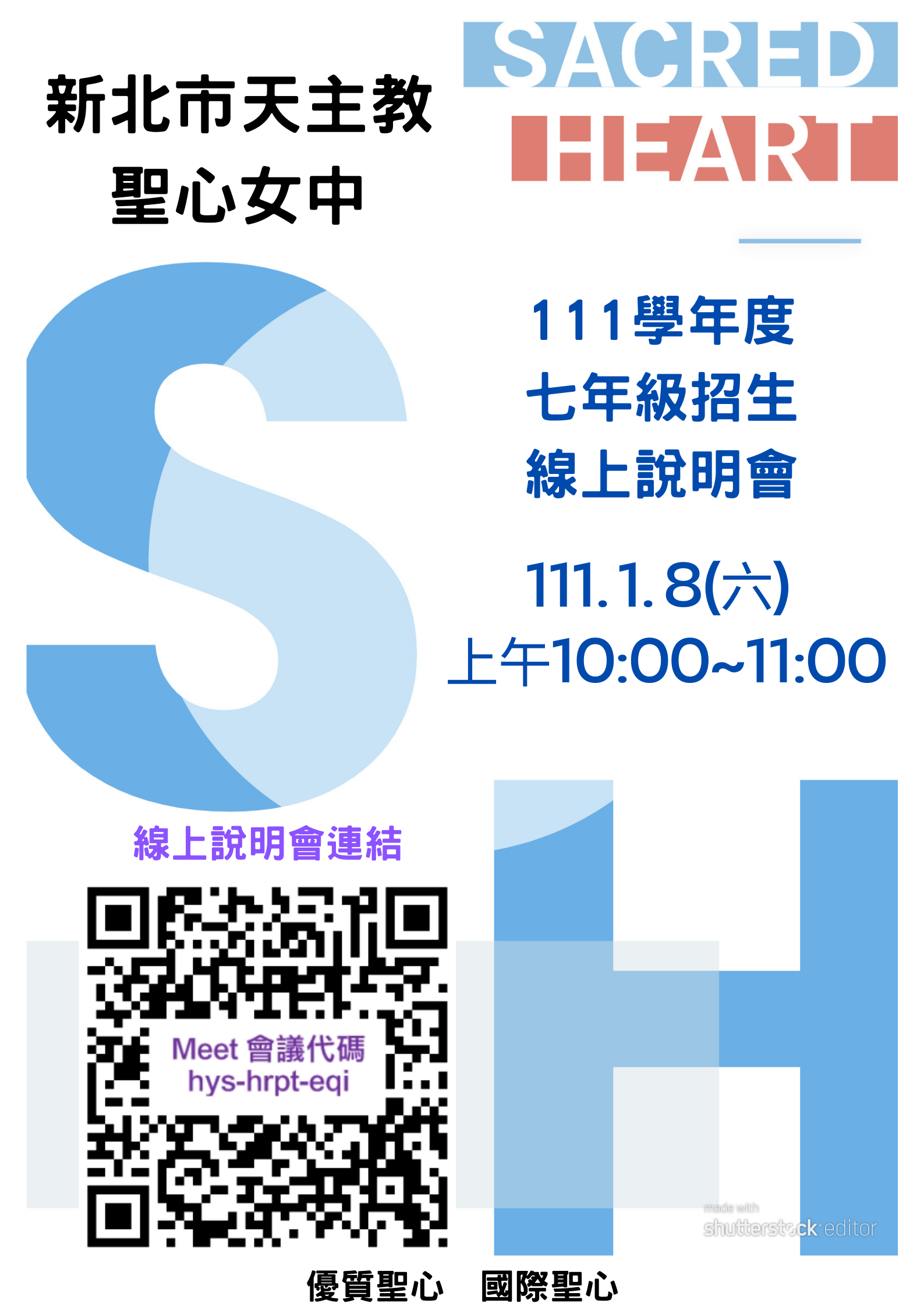 一、訂於111年3月12日(週六)、3月13日(週日)辦理111學年度七年級招生,為協助家長及學生更加了解學校,特於111年1月8日(星期六)上午10點-11點舉辦111學年度七年級招生線上說明會,活動當天可至本校網頁點選連結即可加入。