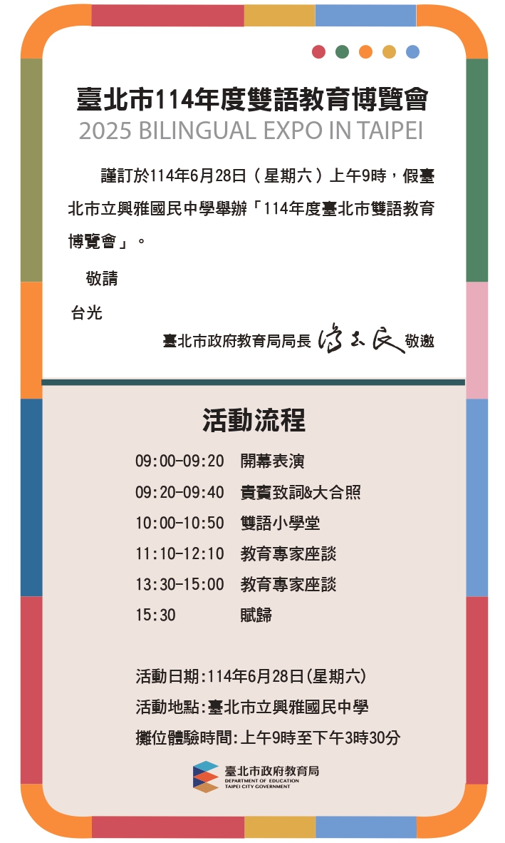臺北市教育局規劃於113年6月28日(星期六)上午9時至下午3時30分於臺北市立興雅國民中學舉辦「2025臺北市教育博覽會」,邀請親師生一同體驗!